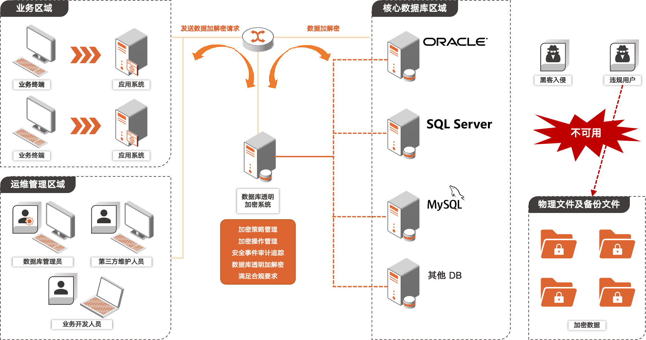 基于数据库透明加密技术对敏感数据进行透明加密,在数据写入数据表前自动加密数据,在数据返回前自动解密,密码运算过程对应用程序和用户透明无感知。